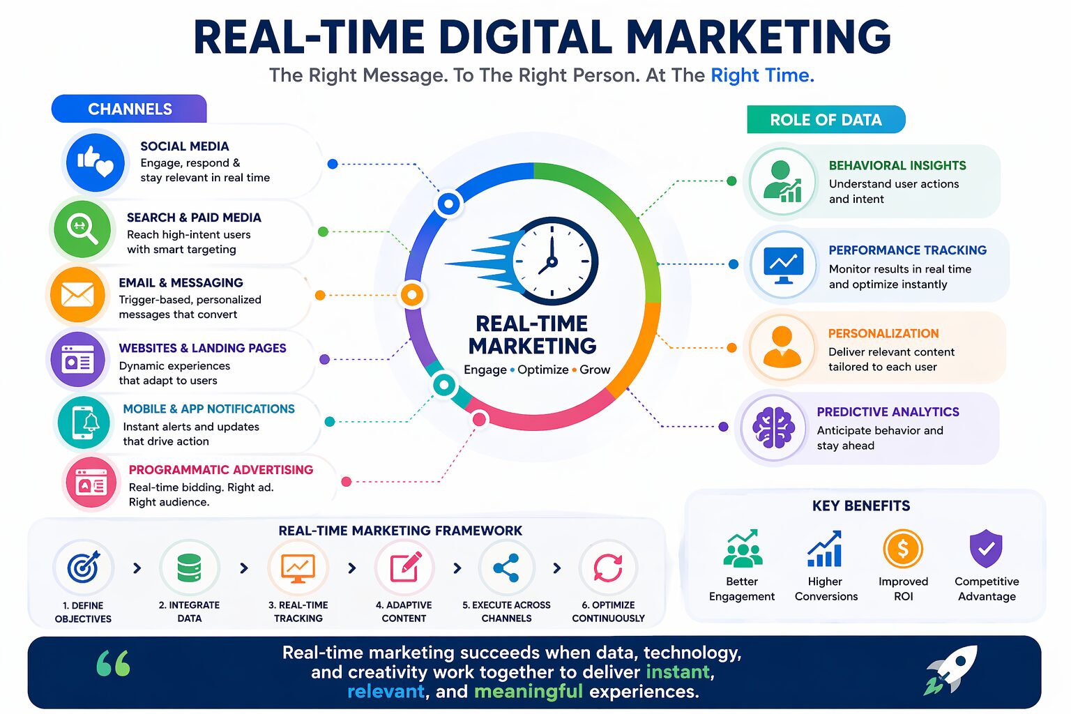 Real-time digital marketing represents a shift from reactive campaigns to adaptive, intelligence-driven marketing systems. In high-performance environments, success is no longer defined by static planning but by the ability to sense, respond, and optimize continuously.